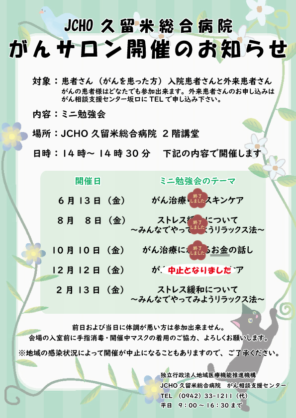『がんサロン』は、講師の都合により急遽中止とさせていただきます。