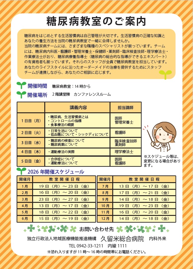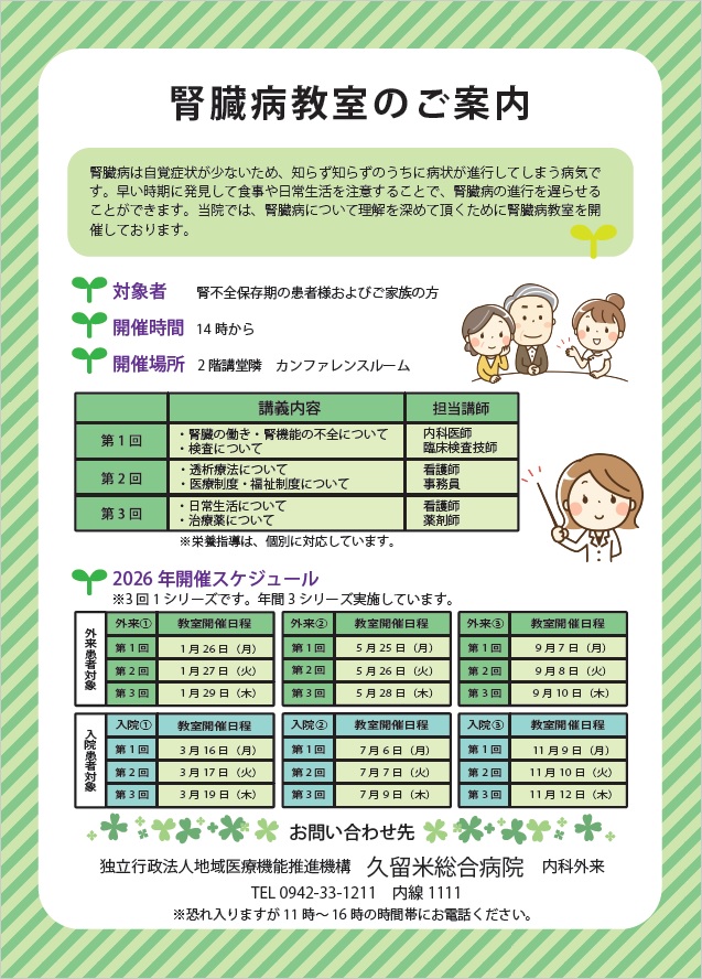 2026年「糖尿病教室」および「腎臓病教室」の開催予定表を掲載しました。